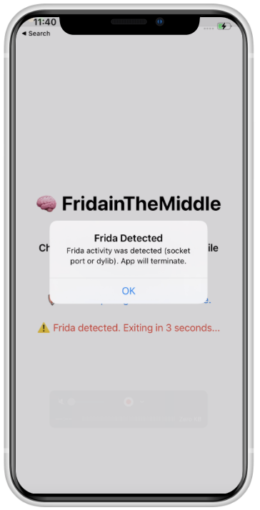 Description: Welcome to FridaInTheMiddle, a Swift-based iOS application that’s extremely sensitive to uninvited interference. It comes equipped with active runtime tamper detection that watches for signs of Frida, whether through suspicious ports, injected dylibs, or unauthorized hooks.