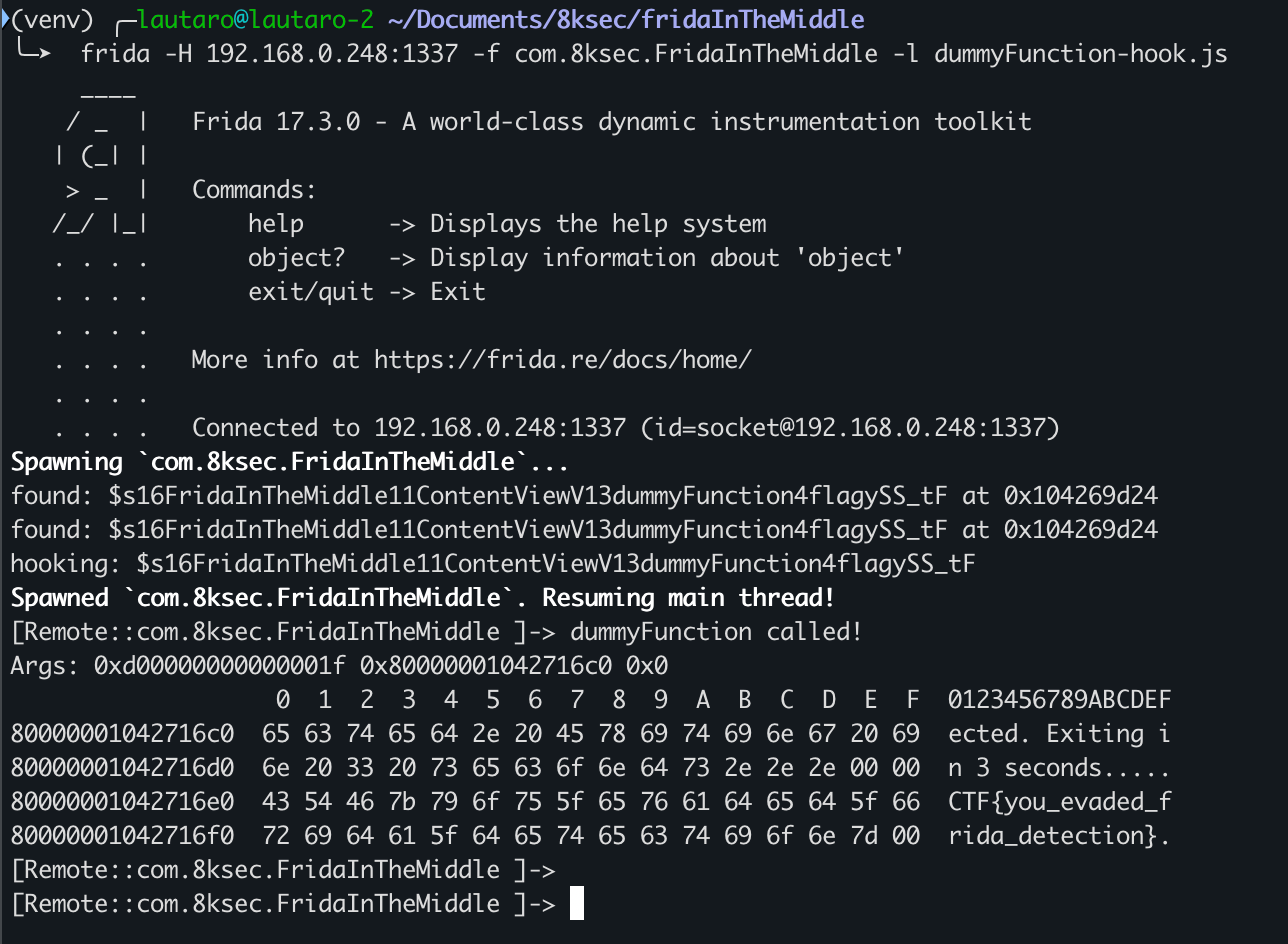 Spawned `com.8ksec.FridaInTheMiddle`. Resuming main thread!